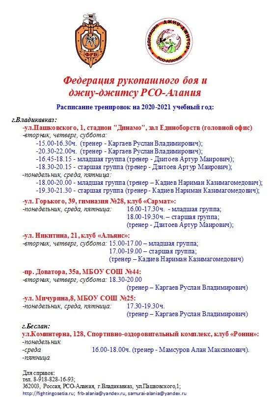 Расписание тренировок групп джиу-джитсу и рукопашного боя в РСО-Алания