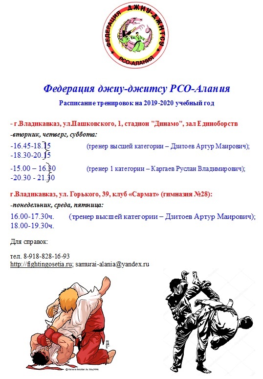 Расписание занятий групп Федерации джиу-джитсу РСО-Алания на 2019-2010 учебный год