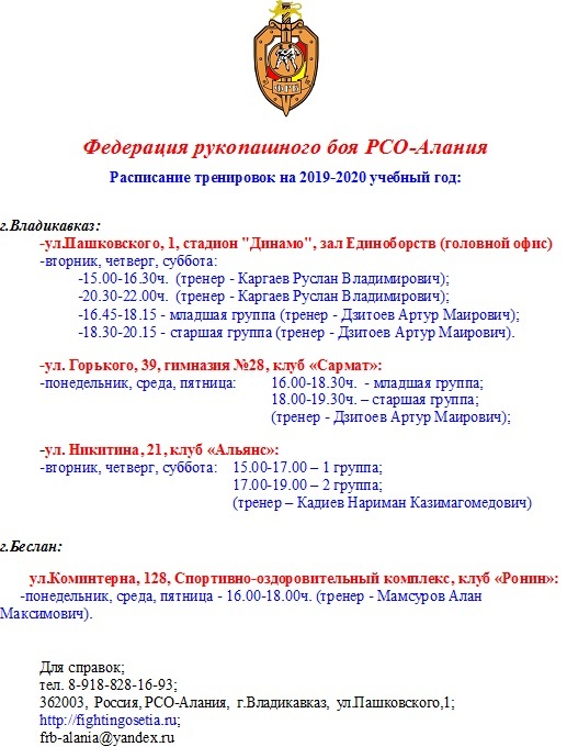 Расписание занятий групп Федерации рукопашного боя на 2019-2020 уч. год